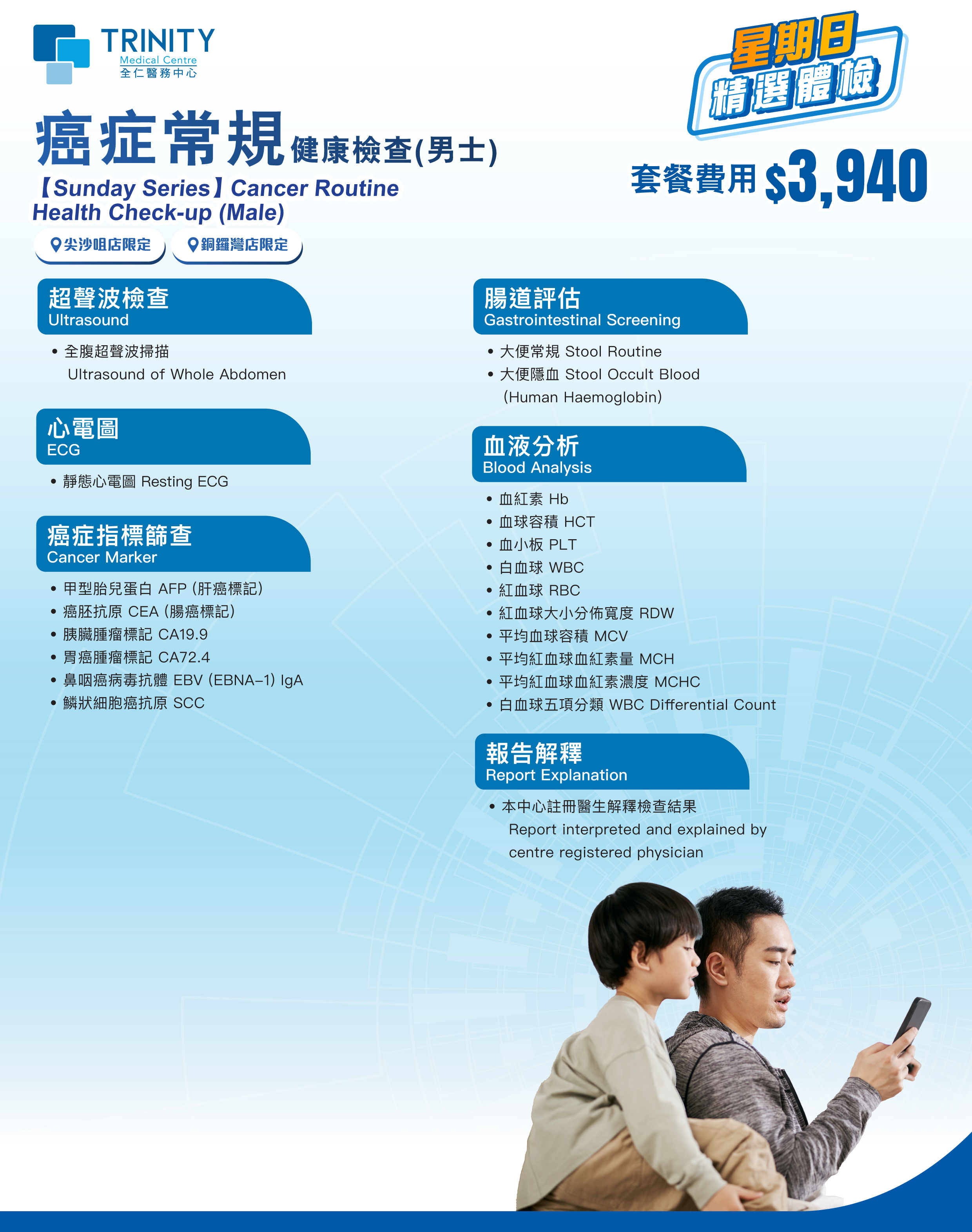 • The health check-up plan is valid at Trinity Medical Centre in Central, Causeway Bay or Tsim Sha Tsui. The offer expires 90 days after the purchase. Customers must undergo the relevant examination on or before the expiration date; the offer becomes void after this date.