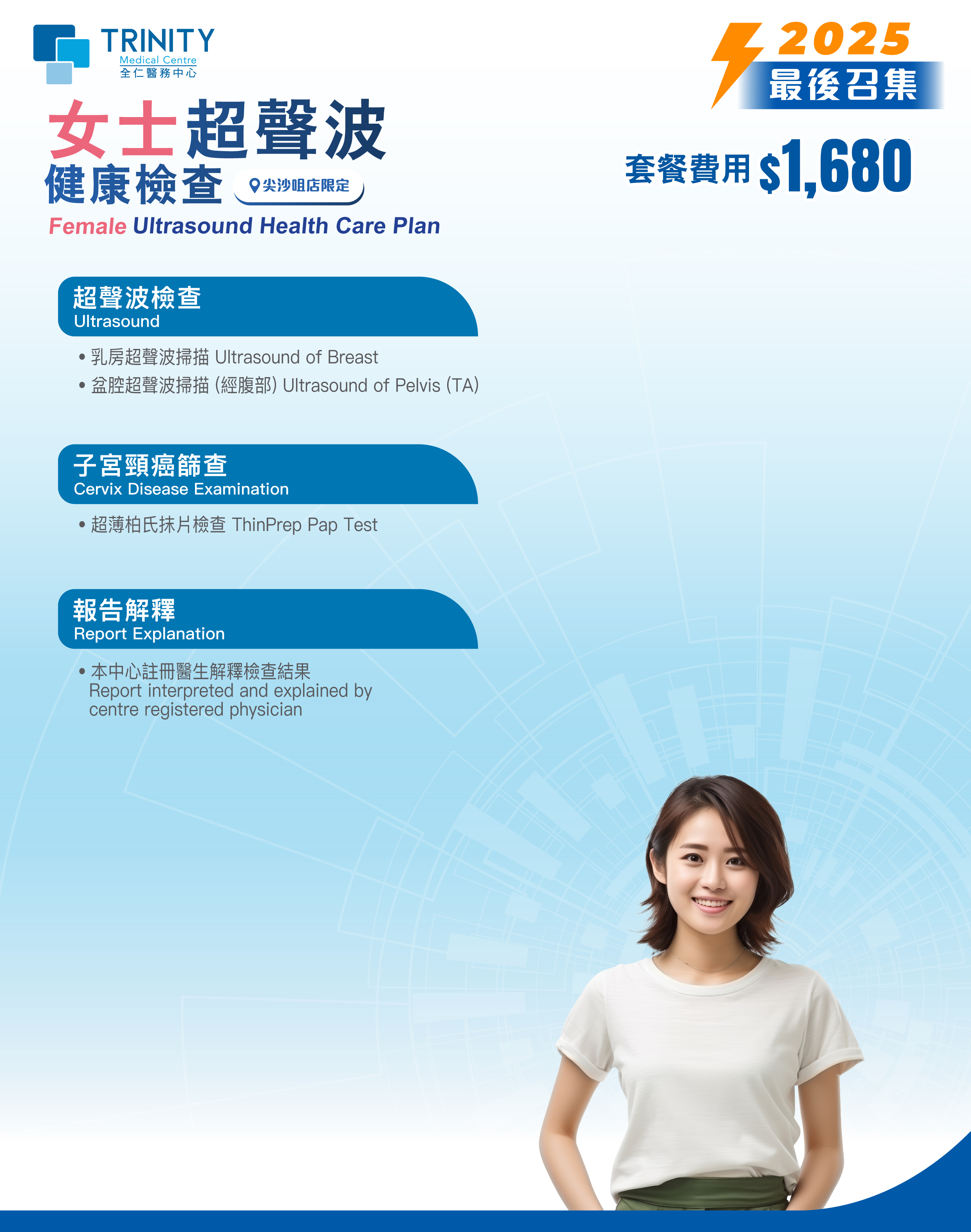 - The health check-up plan is only valid at Trinity Medical Centre in Tsim Sha Tsui. Customers must make an appointment and undergo the relevant check-up on or before 31st December, 2025; the offer becomes void after this date.