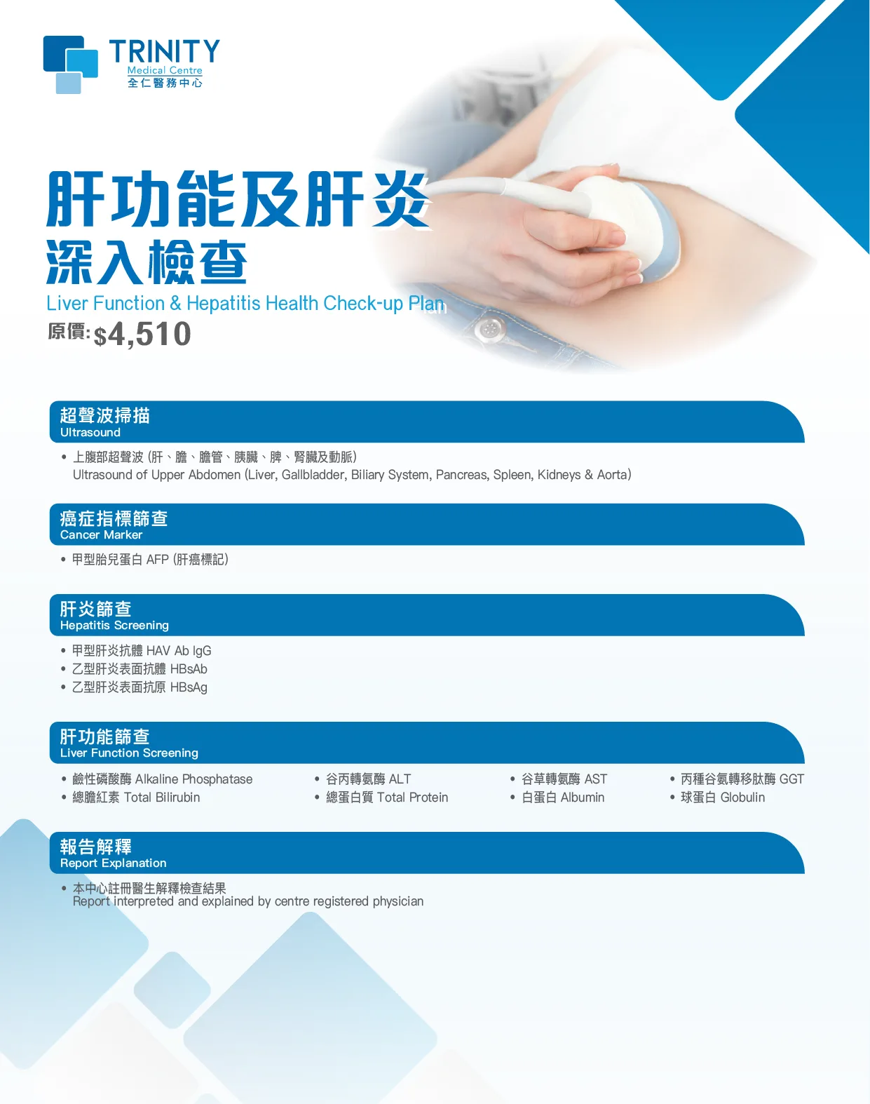 In today's fast-paced world, factors like excessive alcohol consumption, unhealthy diet, lack of exercise, and chronic stress can significantly impact liver health. Our comprehensive Liver Function & Hepatitis Health Check-up Plan combines advanced ultrasound technology with detailed blood tests to screen for various liver conditions including fatty liver, hepatitis, cirrhosis, and liver cancer. Through early detection and professional medical guidance, we can help identify potential liver issues before they become serious concerns. Schedule your liver health assessment today and take a proactive step towards protecting this vital organ!